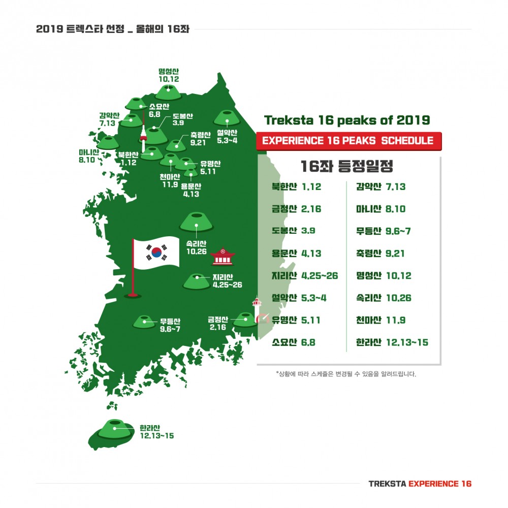 • ???????????국내 토종 아웃도어 전문 브랜드인 ㈜트렉스타(대표이사 권동칠)는 건강한 산행 문화를 조성하고 산과 사람의 정서적 유대를 강화하는 ‘명산 캠페인’의 일환으로 ‘2019, 대한민국 올해의 16좌’를 선정했다고 16일 밝혔다.
