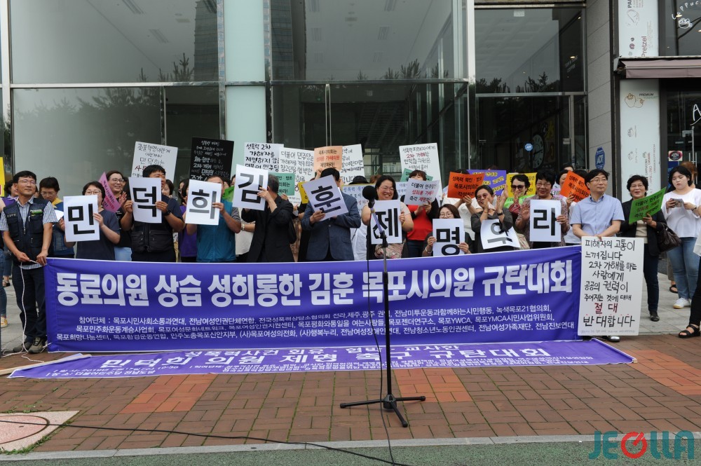 22일, 목포 시민단체가 더불어민주당 전남도당 앞에서 동료의원 성희롱 의혹을 받고 있는 목포시 김 모 의원 규탄대회를 열었다.시민단체는 목포시의회에 해당 의원의 제명을 요구했으며 자신들의 요구가 관철될 때까지 집회를 이어갈 예정이다.